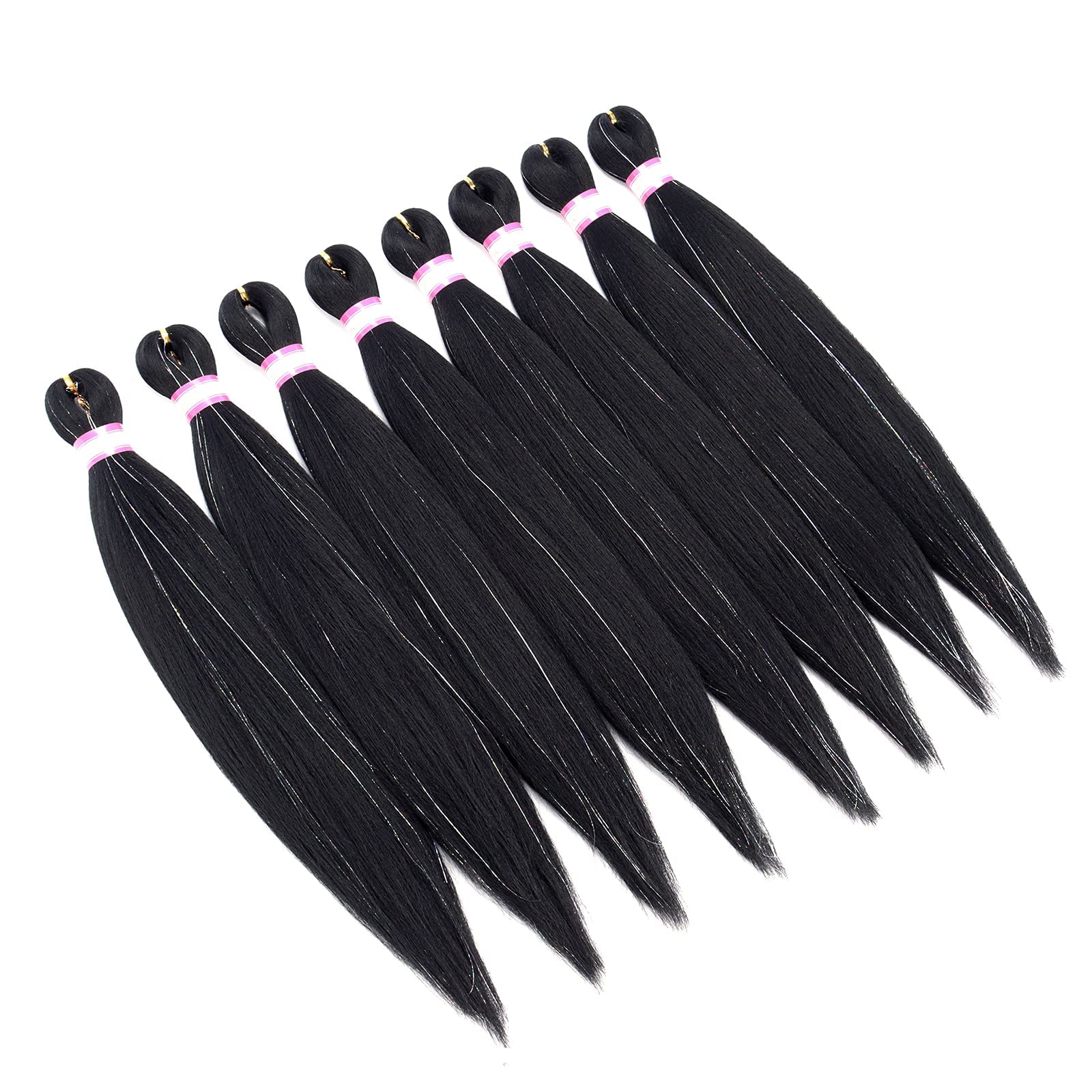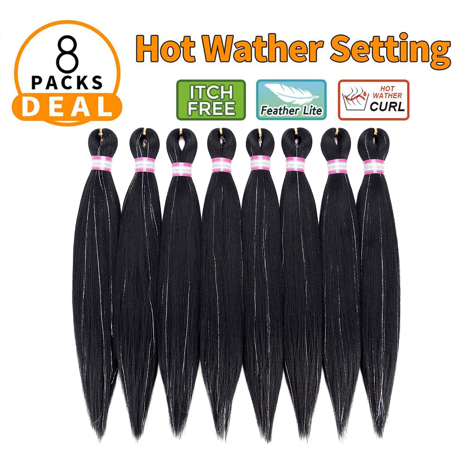 Pre Stretched Braiding Hair 8 Packs 20 Inch with Tinsel Hair Long Professional Hair for Crochet Twist Braids Itch Free Hot Water Setting Yaki Straight Synthetic Hair Extensions (#1B-Tinsel)