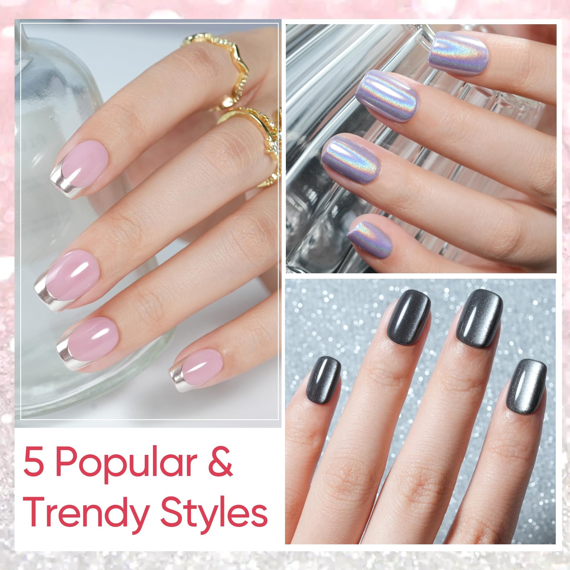 - 【New Upgraded Salon Effects】The set includes 5 new upgraded salon effect short press-on nails: chrome French tip press-on nails/purple rainbow laser press ons / red glitter nails / 2 color cat eye press-on nails (crystal berry, rock gray), a total of 160 pieces. This set of press-on nail kits has various styles and is suitable for various daily combinations.