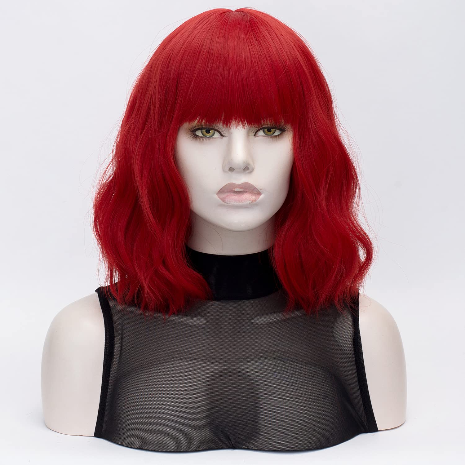 QACCF Short Wavy Shoulder Length Women Full Bang Heat Resistant Wig (Red)