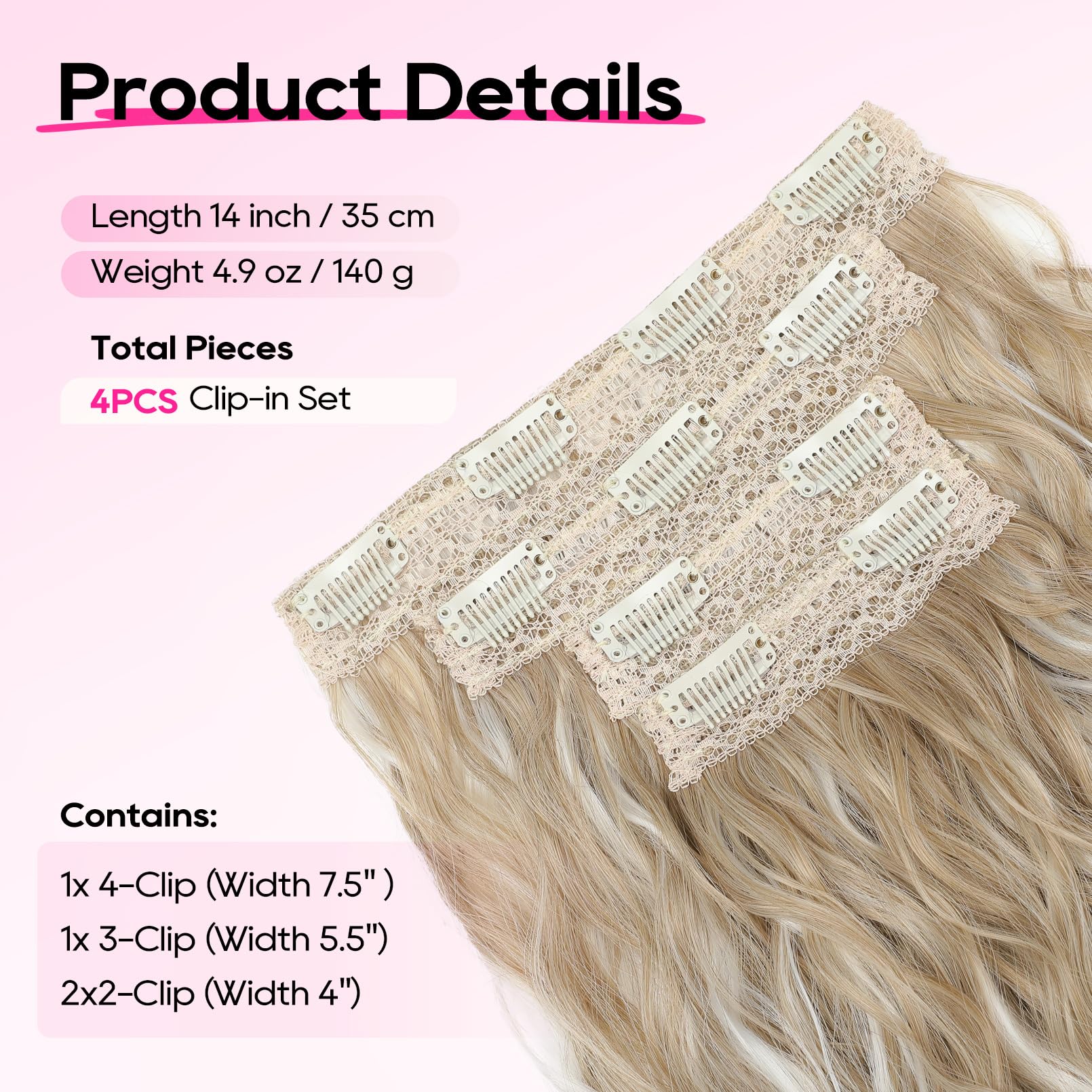 REECHO Clip in Hair Extensions, 4PCS Hair Extensions 14" Short Wavy Hair Extensions Invisible Lace Weft Natural Soft Hairpieces for Women – Ash Blonde with Highlights