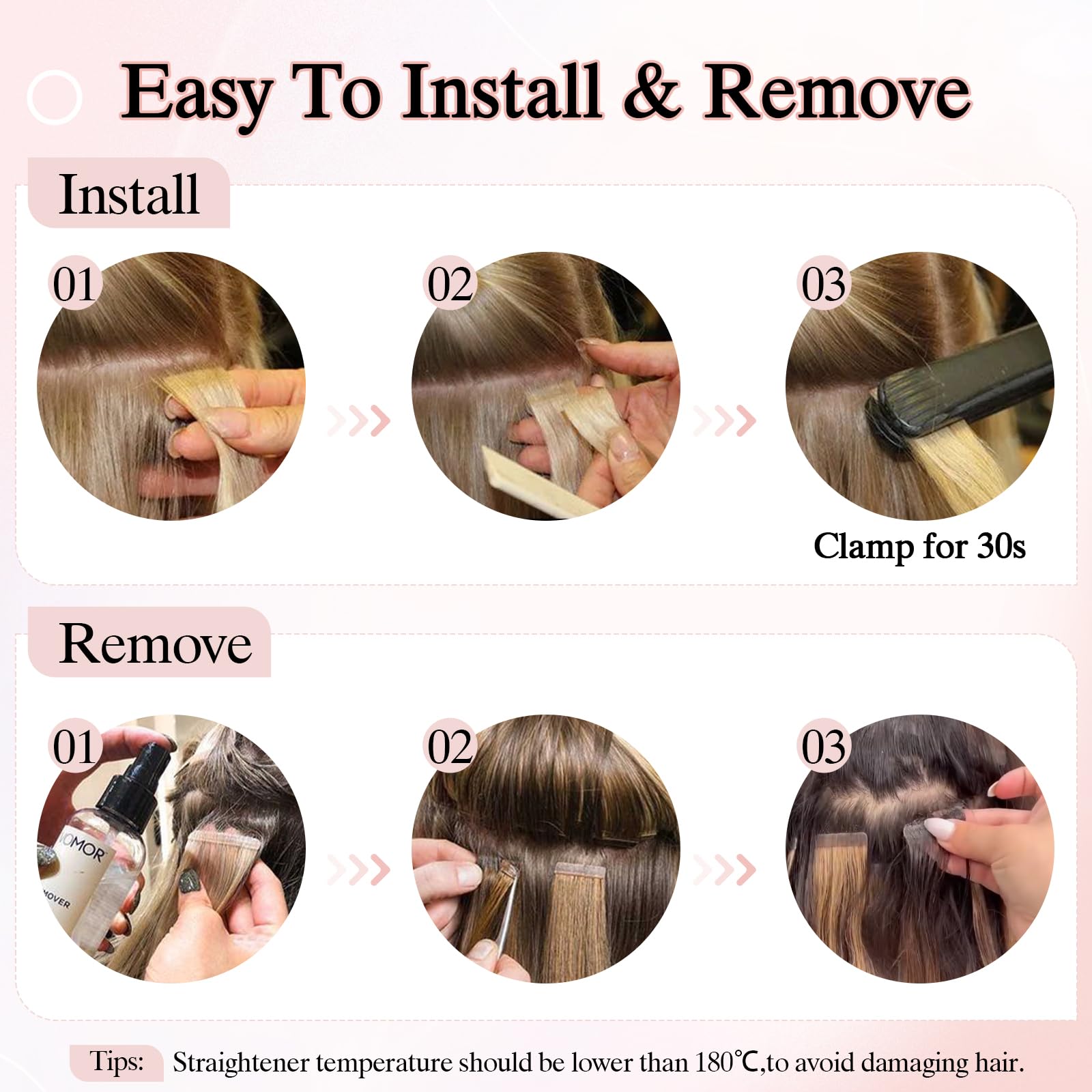 - 【Warm Care Tips】Due to lighting, the monitor, and other factors,the color of the real human hair extensions may differ slightly from the color shown in the picture.We recommend that you consider your natural hair color and choose a color based on the image provided.Be sure to follow the steps shown in the picture for proper application and care.
