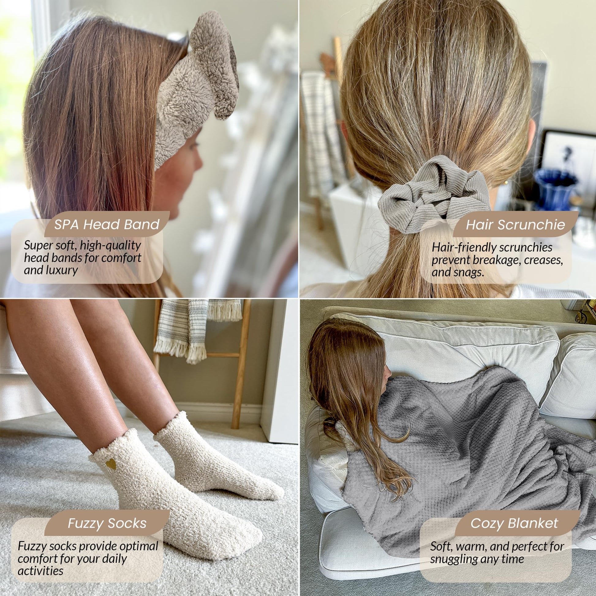 - Surround Yourself In Comfort: The self care gift set for women comes with a 50" x 70" knitted fleece blanket along with fuzzy socks and hair scrungie to offer fuzzy warmth and comfort throughout the year while being easy to clean and maintain for day-to-day use