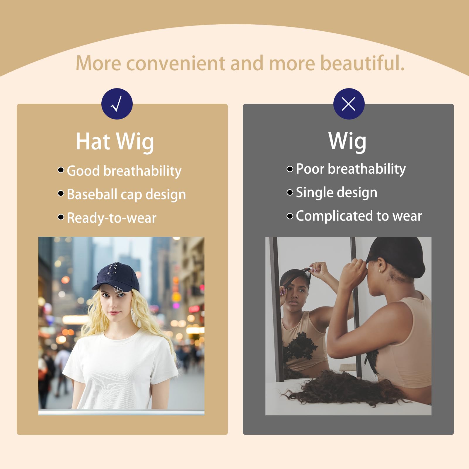 - Fashion-Forward. The baseball cap with hair feature a variety of stylish designs and wig colors to suit your mood and outfits, keeping up with the latest trends. Heading to a festival or a party? Our caps with wigs are the perfect choice for you to stand out and have a great time