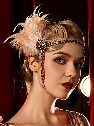 SWEETV 1920s Headpiece Flapper Headband, Rhinestone Pearl Feather Hair Band Great Gatsby Headpiece Accessoreis for Women,Champagne