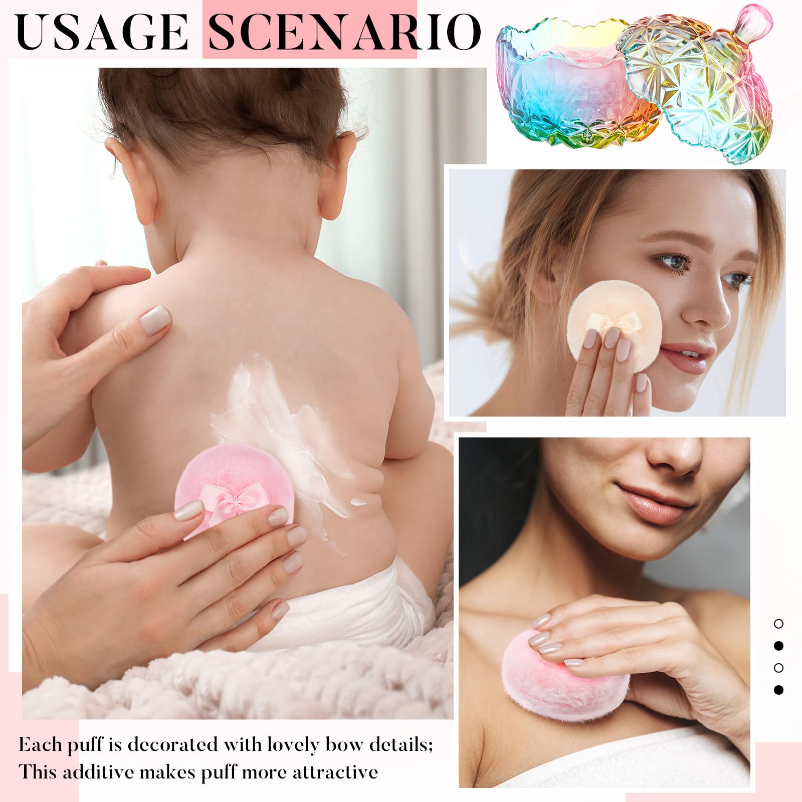 - Skin Friendly Features: the puffs are skin friendly and suitable for all skin types, oily, normal, dry or combination skin; They serve fit for talc, loose powder, body powder and shading powder application; Each powder puff comes adorned with a cute bow detail; This addition enlivens the powder puff and makes it more alluring