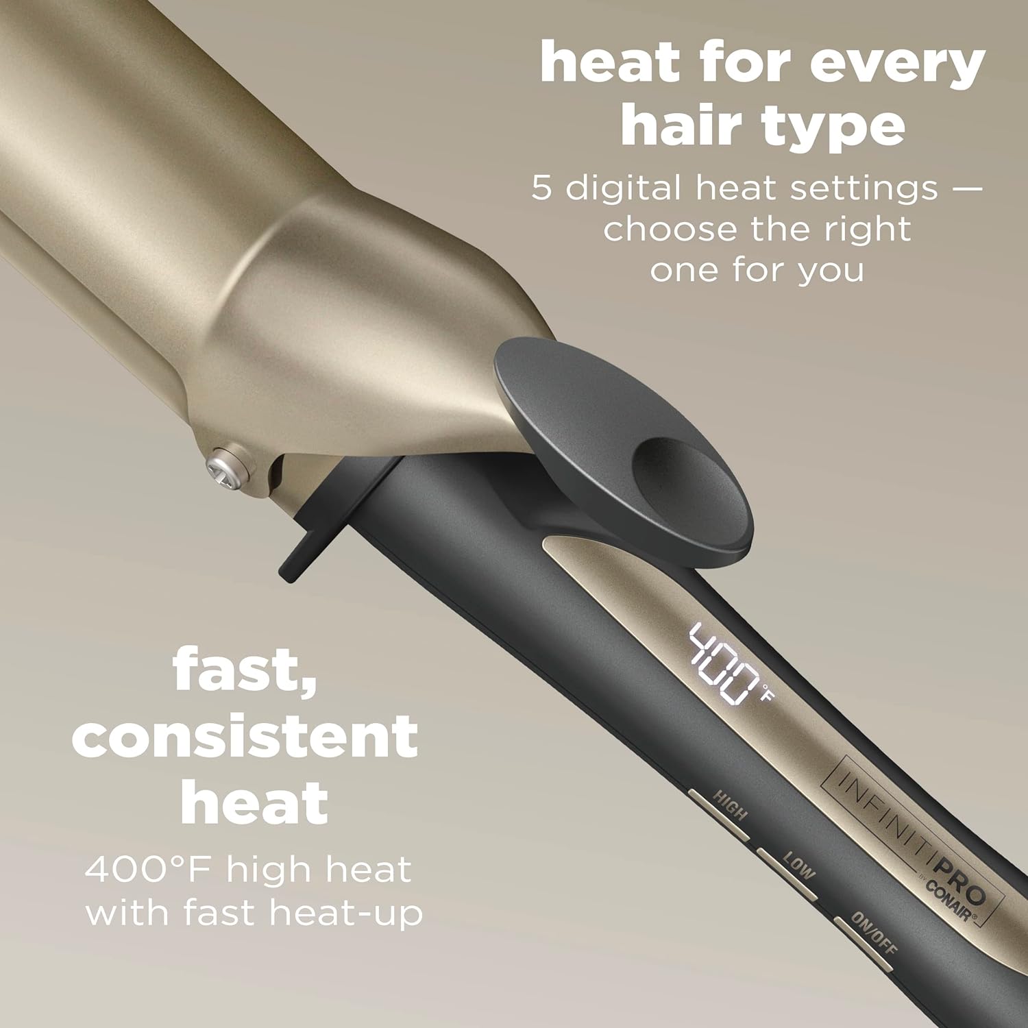 - Digital Wand Curling Iron: this tapered curling wand has a true ceramic heater that heats up in 30 seconds, then reaches a stabilized temperature and maintains the heat level. With 5 heat settings and 400°F high heat, choose the right setting for your hair