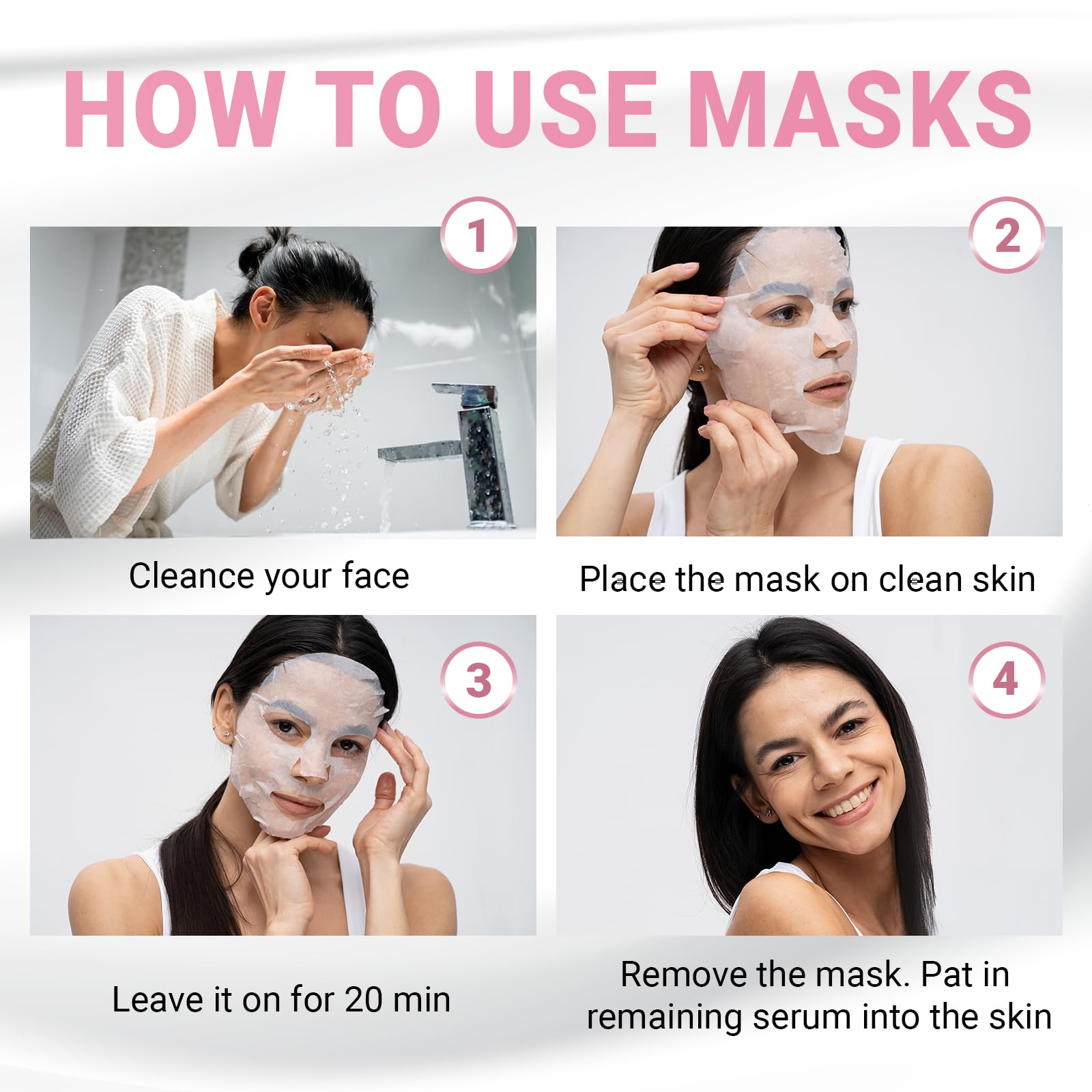 - Easy Use: These collagen face mask sheets come in individual packages designed to be applied to a freshly washed face. The face masks skincare then need only 20 minutes of application time