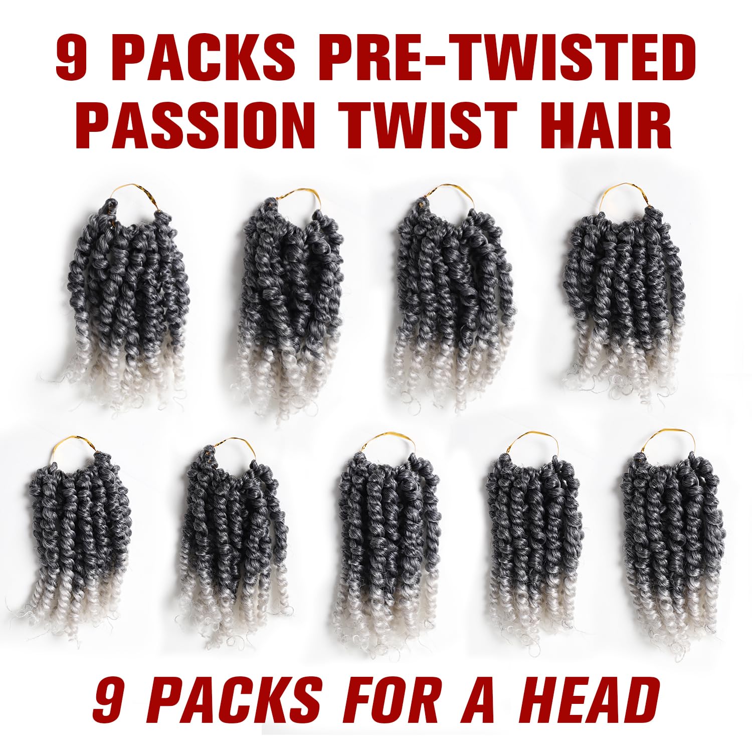 - 3. SIZE & COLOR -(9 Packs, Passion Twist Hair 6 Inch).6 Colors available: 1B, T27, T30, T350, TBUG, TGray. Weight: 25g/Pack, 11 Roots per pack. Usually 9 Packs is enough for a head. with a crochet hair hook as gift.