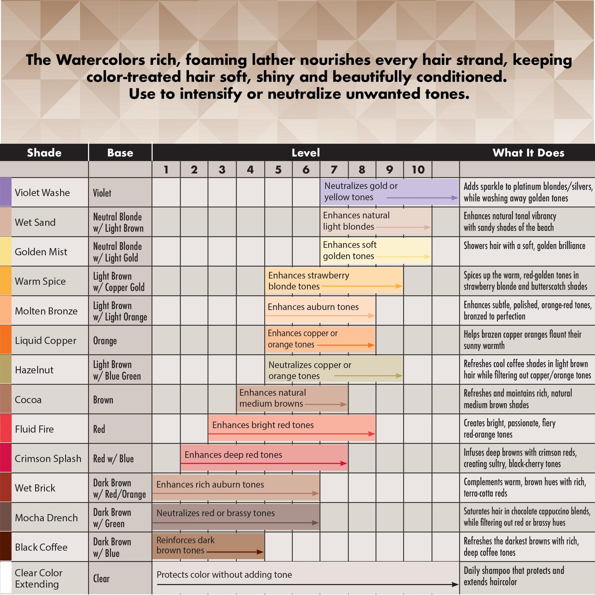 - The Story Of Color Depositing Shampoo. Watercolors Shampoo creates hair color and eliminates fading, keeping colors intense, bright, shiny and on-tone . Excels at providing temporary fashion colors on natural level 7 and pre-lightened hair. This is a color refresher that boosts your vibrant tones in between salon visits, keeping your hair looking fresh, shiny and soft