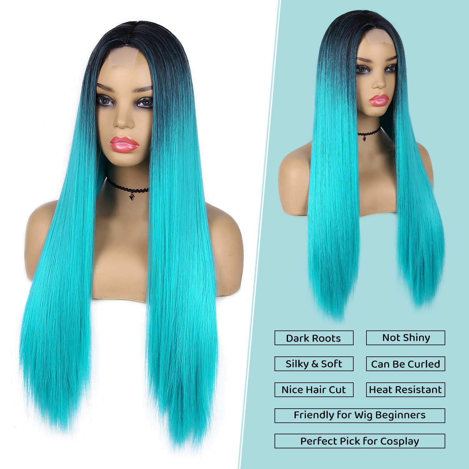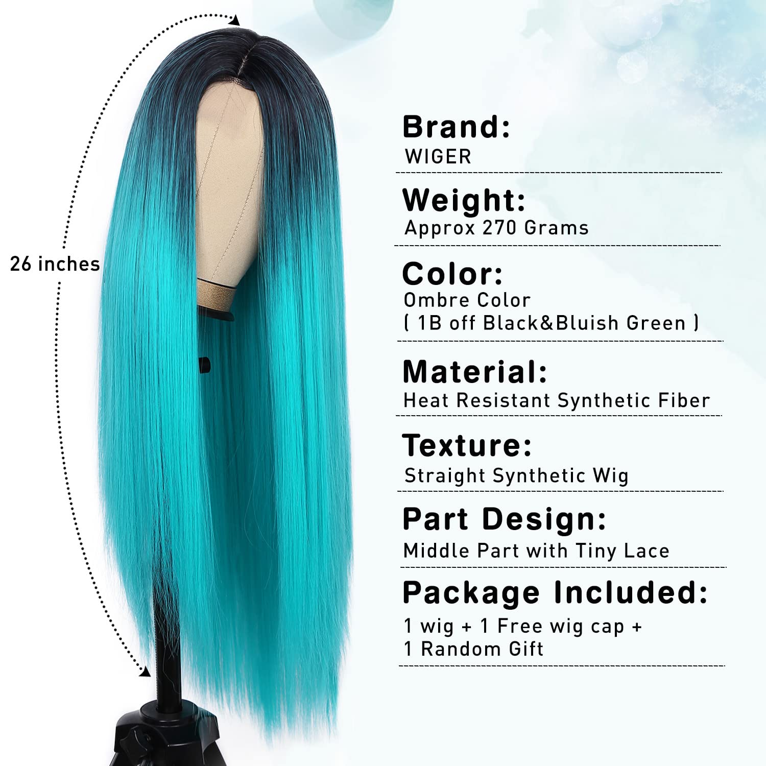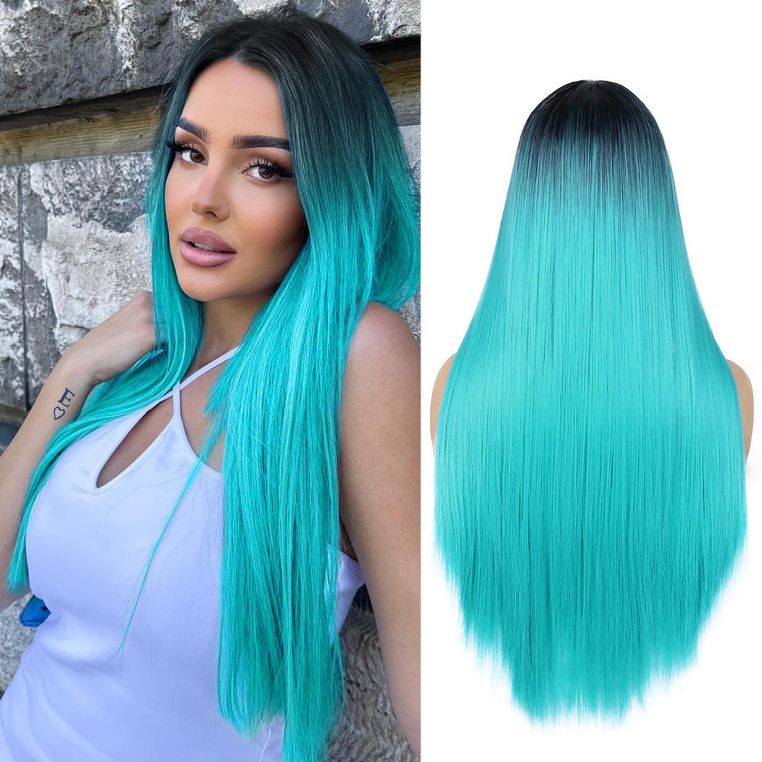 WIGER Straight Bluish Green Wig for Women Ombre Teal Blue Wigs Long Straight Turquoise Wig Hair Middle Part Heat Resistant Synthetic Blue Mermaid Wigs Cosplay Party Costume Wig