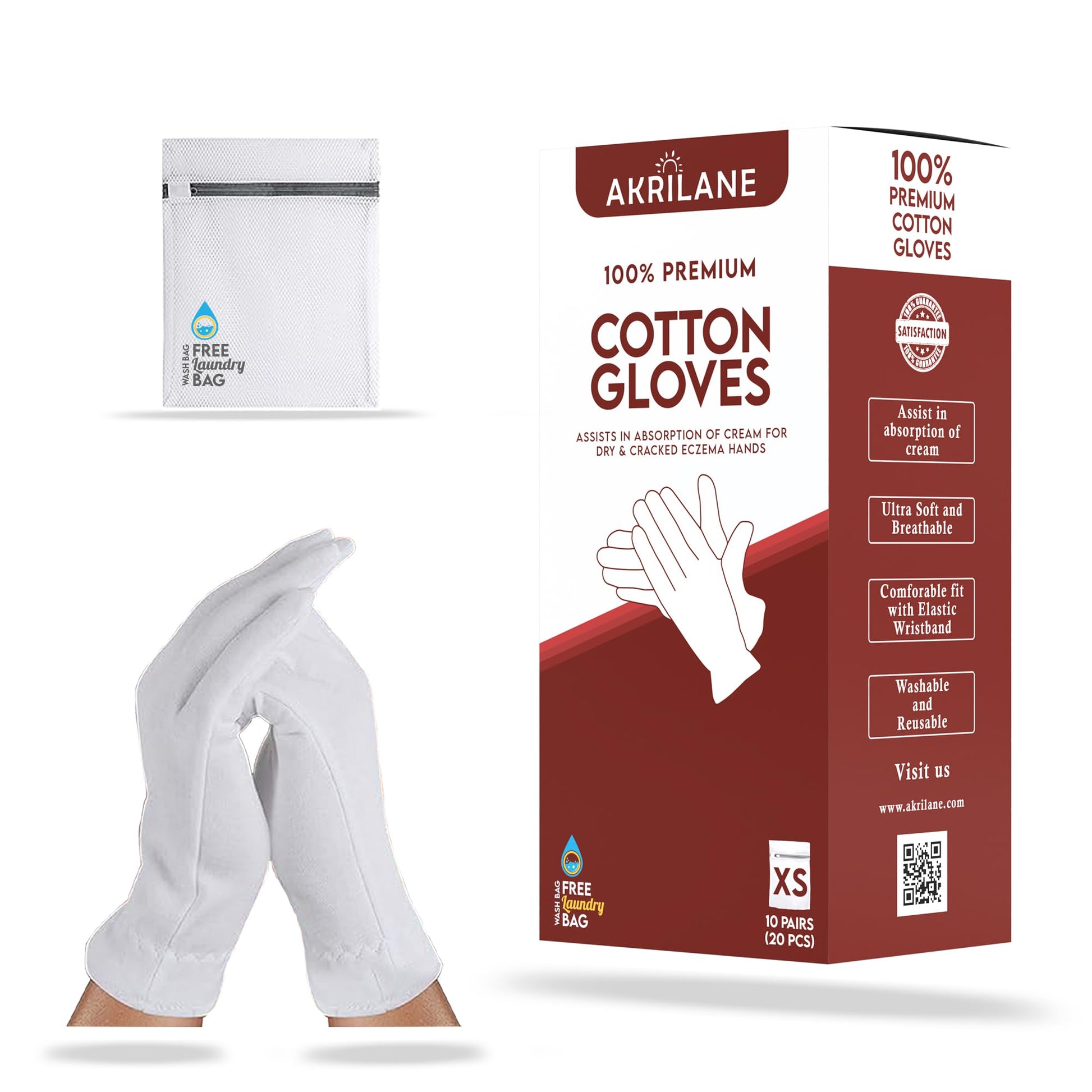 - ✨ EFFECTIVE MOISTURIZING RELIEF | DERMATOLOGIST RECOMMENDED - Akrilane's premium 100% cotton white gloves are designed to heal dry, cracked hands and provide relief for eczema and psoriasis. These gloves enhance the effectiveness of hand lotions and creams, resulting in softer and smoother skin, making them an ideal solution for those who frequently wash their hands. 🧤