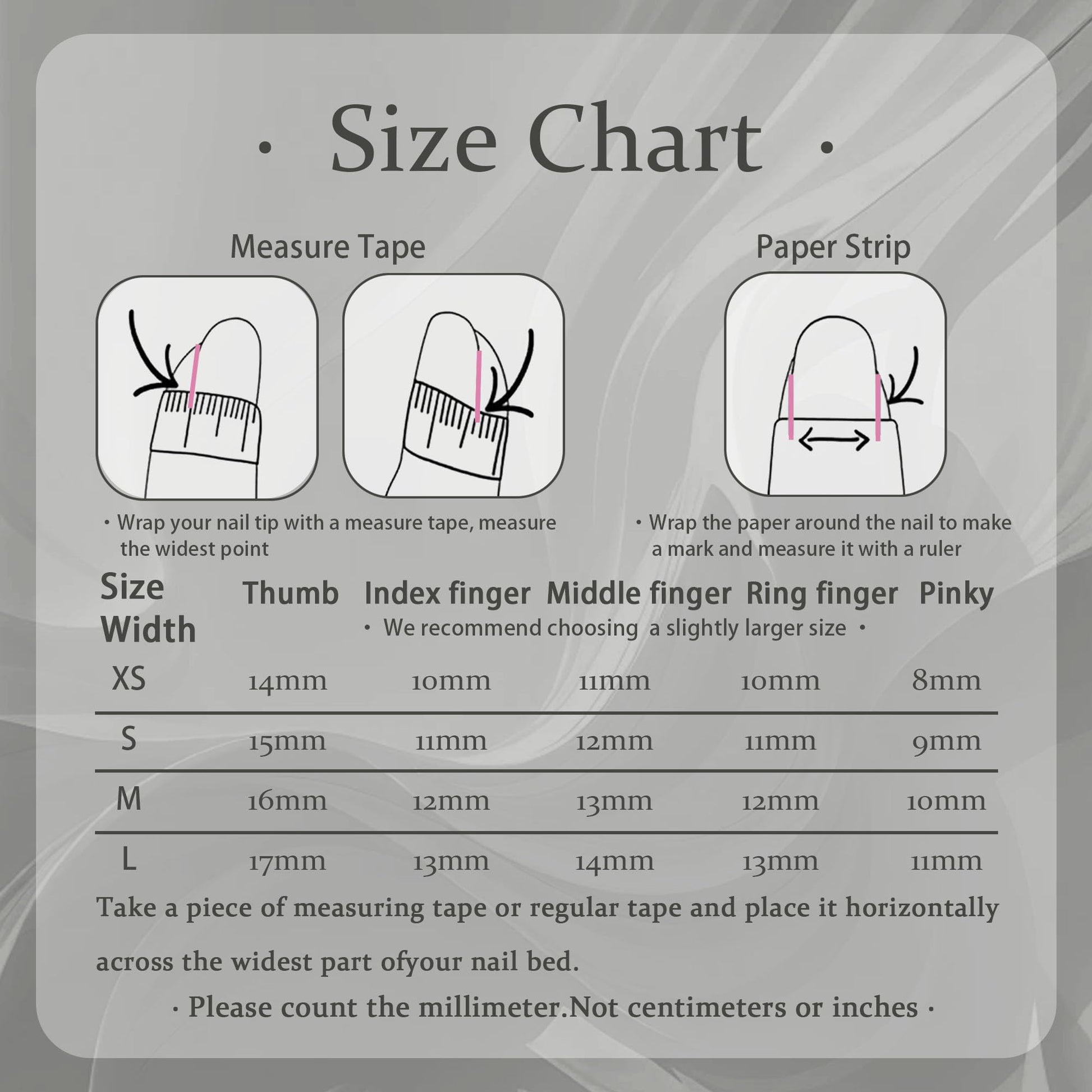 - About Size: There are four sizes of hand-made nails: XS, S, M and L. Please refer to the size description picture, which indicates the size range of each nail